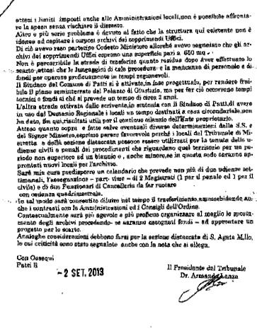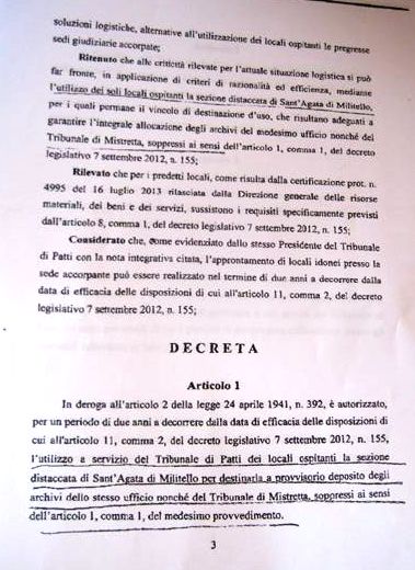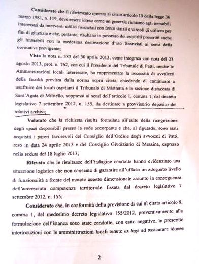 ” …un decreto che autorizzi, per un periodo di ulteriori due anni, l’utilizzo al servizio del Tribunale di Patti dei locali ospitanti la sezione distaccata di Sant’Agata Militello e del Tribunale di Mistretta… con modalità all’uopo individuate, quali mantenimento dei carichi pendenti o dei soli archivi”. Ripartiamo da qui, proprio da alcuni passaggi, identici e testuali, dei comunicati inoltrati dal senatore Bruno Mancuso, dapprima il 4 Settembre, poi, il 7 Settembre, per fare chiarezza su presunte aspettative ingenerate e deluse e provare a ricomporre, almeno secondo il nostro punto di vista, l’intrigatissimo puzzle legato alla chiusura della sede staccata del Tribunale a Sant’Agata Militello e Mistretta . A far polemica, strumentale, ci si mette sempre molto poco. C’è chi l’ha chiamato bluff, chi ha parlato di inganni smascherati, di promesse non mantenute. Prevedibile. Più preciso sarebbe invece dire che quel decreto che “autorizzi, per un periodo di ulteriori due anni, l’utilizzo al servizio del Tribunale di Patti dei locali ospitanti la sezione distaccata di Sant’Agata Militello…” così come annunciato dal senatore Mancuso dopo l’incontro col ministro della Giustizia, Anna Maria Cancellieri, effettivamente e puntualmente è arrivato (galleria foto in basso). Allo stesso modo non può non evidenziarsi come il contenuto di quel decreto non sia indubbiamente quello sperato, anzi, evidentemente non può essere soddisfacente per nessuno visto che quelle che lo stesso Mancuso aveva definito “modalità all’uopo individuate, quali mantenimento dei carichi pendenti o dei soli archivi” si sono materializzate nella parte più scomoda e meno appetibile, quella dei soli archivi appunto. Quali aspettative deluse ? Quali bluff ? Quello che resta è solo una realtà, dura appunto, con cui tutti sono costretti a confrontarsi. La sede staccata di Sant’Agata Militello ed il Tribunale di Mistretta chiudono i battenti, nessuno aveva osato dire il contrario (“…pur sulla strada ormai intrapresa dal governo verso il passaggio ai tribunali principali”, comunicato Mancuso 4 Settembre) e niente e nessuno, da ogni parte d’Italia, è riuscito a far desistere dal proposito di portare a traguardo la legge delega varata dall’allora governo presieduto da Mario Monti, partorita con evidenti scollature tra ciò che il governo del “professore” ha ideato e la realtà del tessuto sociale e geografico dell’Italia intera. Nell’economia del discorso, gioverebbe piuttosto segnalare come il decreto del 5 Settembre firmato dal ministro Anna Maria Cancellieri richiami una nota del presidente del tribunale di Patti, datata 30 Aprile 2013 ed integrata con nota del 23 Agosto 2013, circa una richiesta di mantenimento dei locali della sede santagatese per come “provvisorio depositi degli archivi”. In nostro possesso (secondo allegato foto in basso) c’è invece un’altra nota del presidente del tribunale di Patti, datata 2 Settembre 2013, dalla quale emerge in conclusione un parere favorevole affinché “i locali del tribunale di Mistretta e della sede staccata di Sant’Agata Militello possano essere utilizzati per la tenuta delle udienze civili e penali… per un periodo non superiore al biennio…”. Lo stesso presidente, dott. Armando Lanza, segnalava quindi al ministro la disponibilità a predisporre un preciso calendario di udienze e l’assegnazione del relativo personale. Una nota che non lascerebbe dunque spazio ad altre interpretazioni, un’istanza puntale e precisa che evidentemente, nonostante l’autorevolezza dello scrivente e le sollecitazioni politiche, non ha fatto breccia nel ministro la quale, legittimamente quanto discutibilmente, ha deciso di andare per la sua strada. Ecco dunque che si arriva alla firma del decreto, quello promesso dal ministro, annunciato e puntualmente arrivato, ma che, come detto, non può soddisfare nessuno per i suoi contenuti. Non soddisfa ovviamente Mistretta, spogliata di qualunque cosa, e non soddisfa Sant’Agata, la sua comunità, gli operatori del settore giudiziario ed i cittadini del vasto comprensorio dei Nebrodi che a quella sede distaccata facevano riferimento. Il mantenimento dei soli archivi è davvero troppo poco. Da più parti si legge e si sente di mobilitazioni e proteste che, però, purtroppo, per quanto condivisibili e sostenibili a gran forza rischiano di suonare solo come un rabbioso requiem. Sit-in e mobilitazioni si susseguiranno in questi giorni, da quelle già organizzate a Sant’Agata e Mistretta, alla proposta di bloccare autostrada e ferrovia. Intanto la prima comunicazione ufficiale riguarda l’organizzazione di un corteo di protesta per Giovedì mattina dalle 9 alle 12 a Sant’Agata Militello (file pdf allegato).