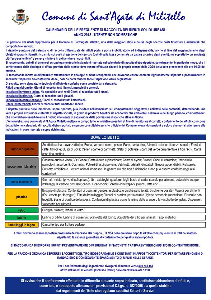 Pubblicata dal comune di Sant’Agata Militello una nota esplicativa delle modalità di conferimento della raccolta differenziata dei rifiuti, anche alla luce di alcune inesattezze riportate nelle stampe consegnate agli utenti insieme ai nuovi kit per la differenziata. Già alcuni giorni addietro il nostro sito aveva proposto un pezzo con TUTTI I DETTAGLI.