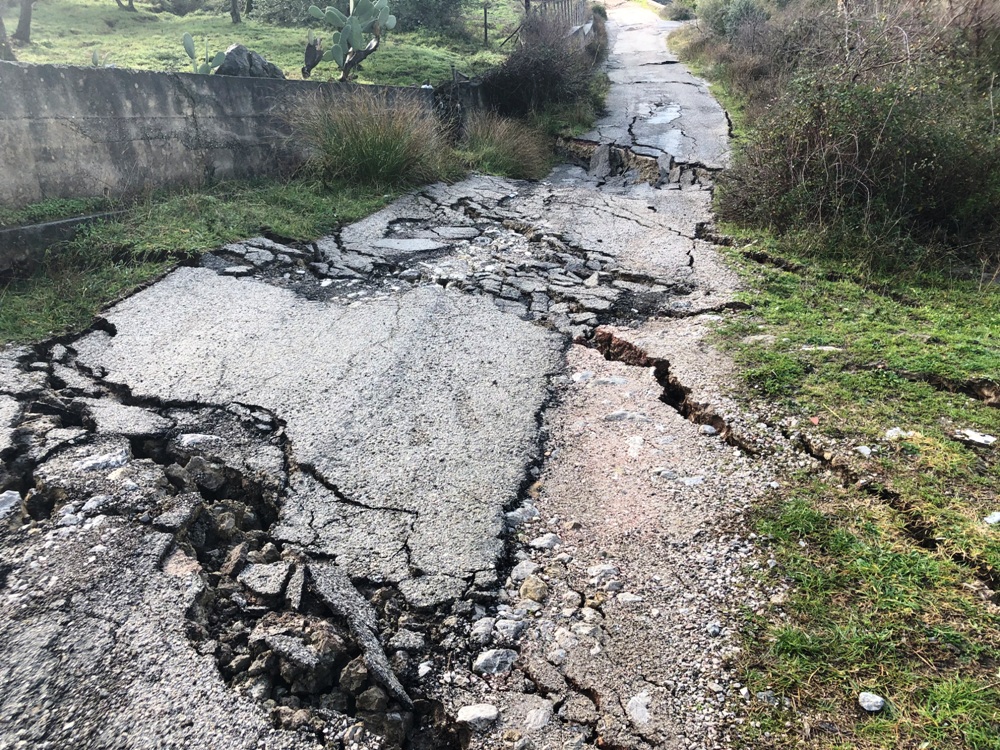 Un movimento franoso con una corona di oltre 300 metri, con scivolamento del terreno verso il torrente Inganno per un fronte di lunghezza di oltre 500 metri. Dai primi sopralluoghi svolti questa mattina da parte del personale dell’ufficio tecnico comunale, insieme alla Polizia locale, i Vigili del Fuoco e l’amministrazione comunale, si evidenzia come il terreno presenti salti di quota di circa 2 o 3 metri, mentre la strada che collega l’entroterra agricolo del territorio comunale non è assolutamente praticabile. Inoltre nel tratto interessato dalla frana, insiste la condotta di adduzione proveniente dalla sorgente Peluso, che è stata interamente collassata procurando l’interruzione dell’erogazione idrica nelle contrade Vallebruca, Fiorita, Sprazzì e San Giovanni.