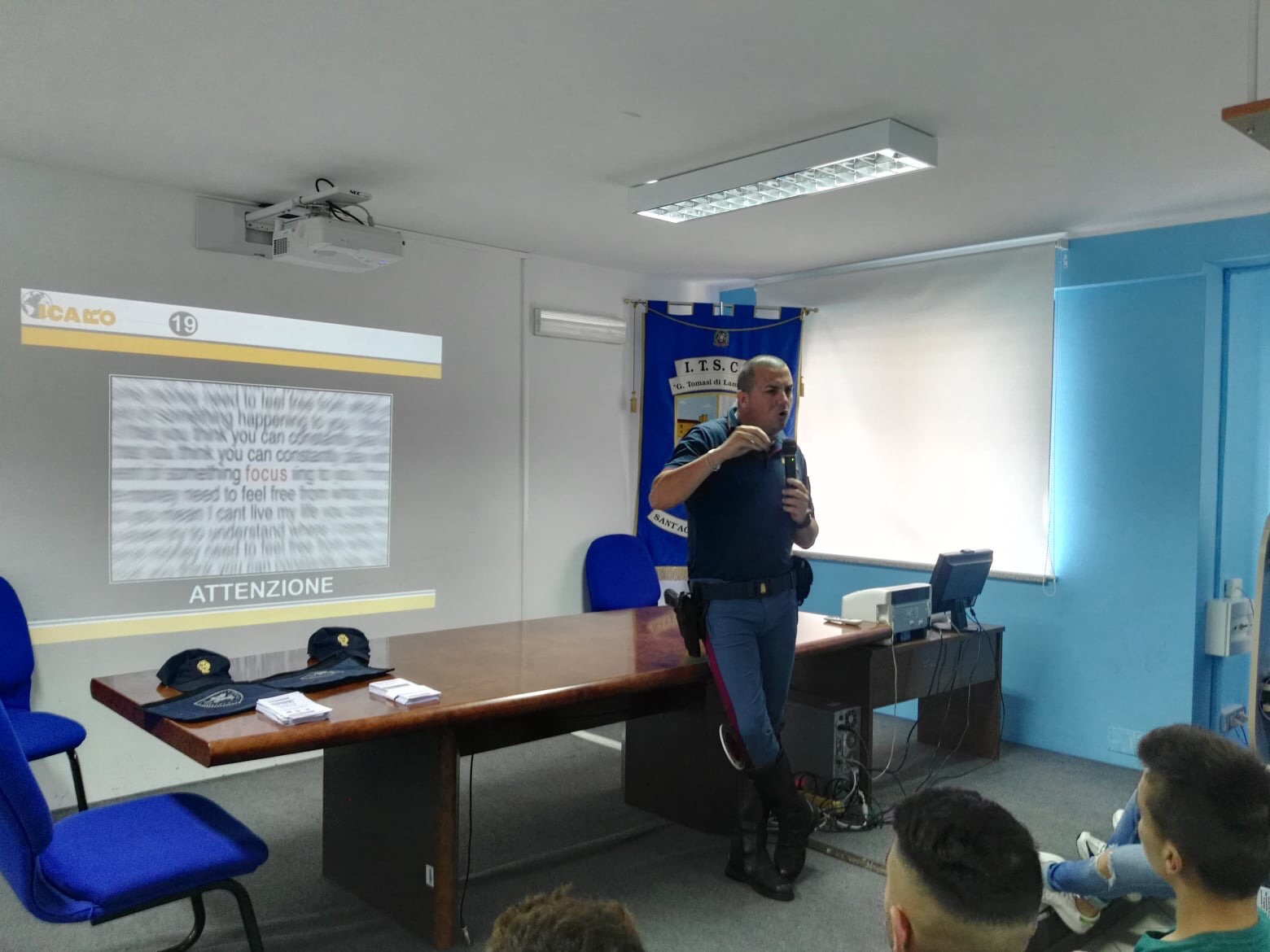Ad intervenire ed illustrare il progetto, grazie alla collaborazione della prof.ssa Antonella Sciotto, sono stati, nell’ aula magna dell’ITET “G. Tomasi di Lampedusa”, il Sostituto Commissario Massimiliano Fiasconaro, responsabile del Distaccamento di Polizia Stradale di Sant’Agata Militello e l’ispettore Filippo La Rosa. Dall’analisi dei dati risulta ancora sconcertante il numero dei morti per incidenti stradali in Europa, anche se in progressiva diminuzione. In Italia nel 1972 i morti sono stati 11072, nel 2001 il numero scende a 7.096, mentre lo scorso anno i decessi a causa di incidenti stradali sono stati 3.325, mentre i feriti sono stati 242.621. Un numero comunque inaccettabile. Il miglioramento delle tecnologia a bordo delle auto ha contribuito ad aumentare gli standard di sicurezza, ma al contempo negli anni si sono aggiunte altre distrazione alla guida. Su tutte, l’uso degli smartphone alla guida rappresenta un pericolo costante, alimentato dalla presunzione di poter essere multitasking, mettendo in tal modo a rischio la propria vita e quella degli altri.