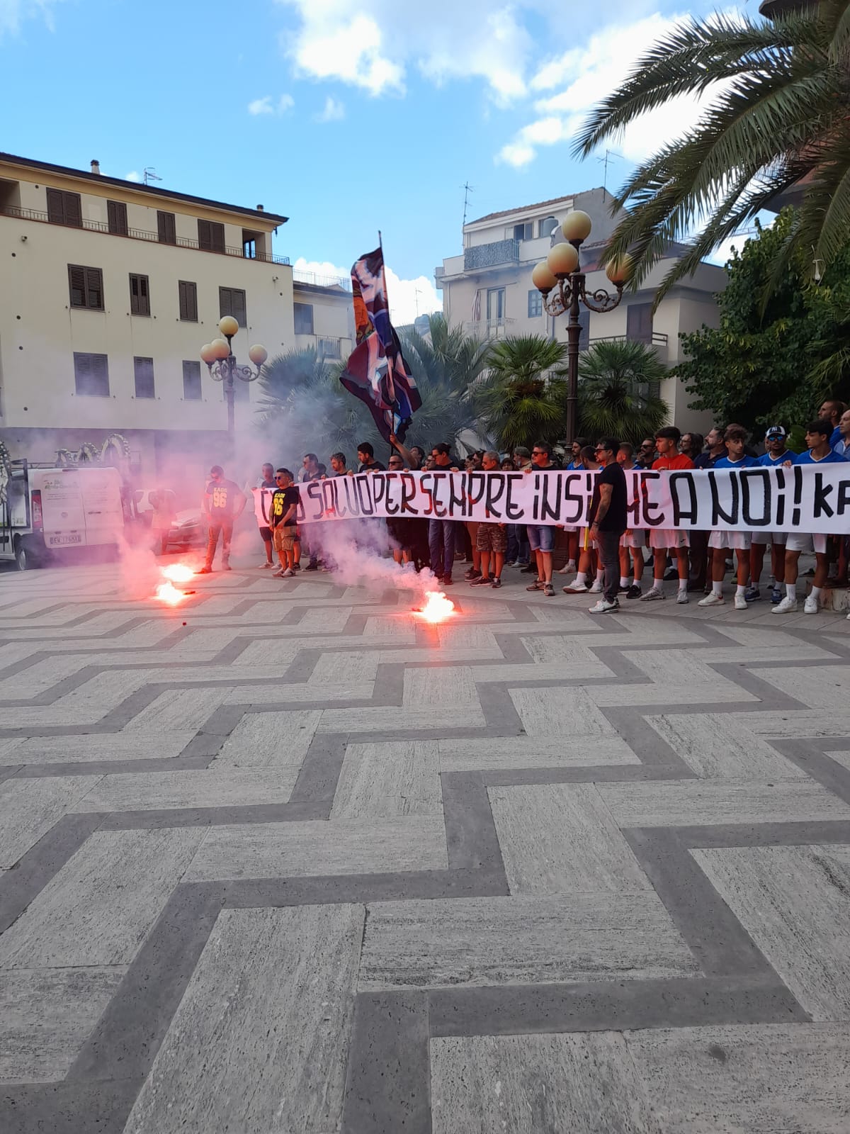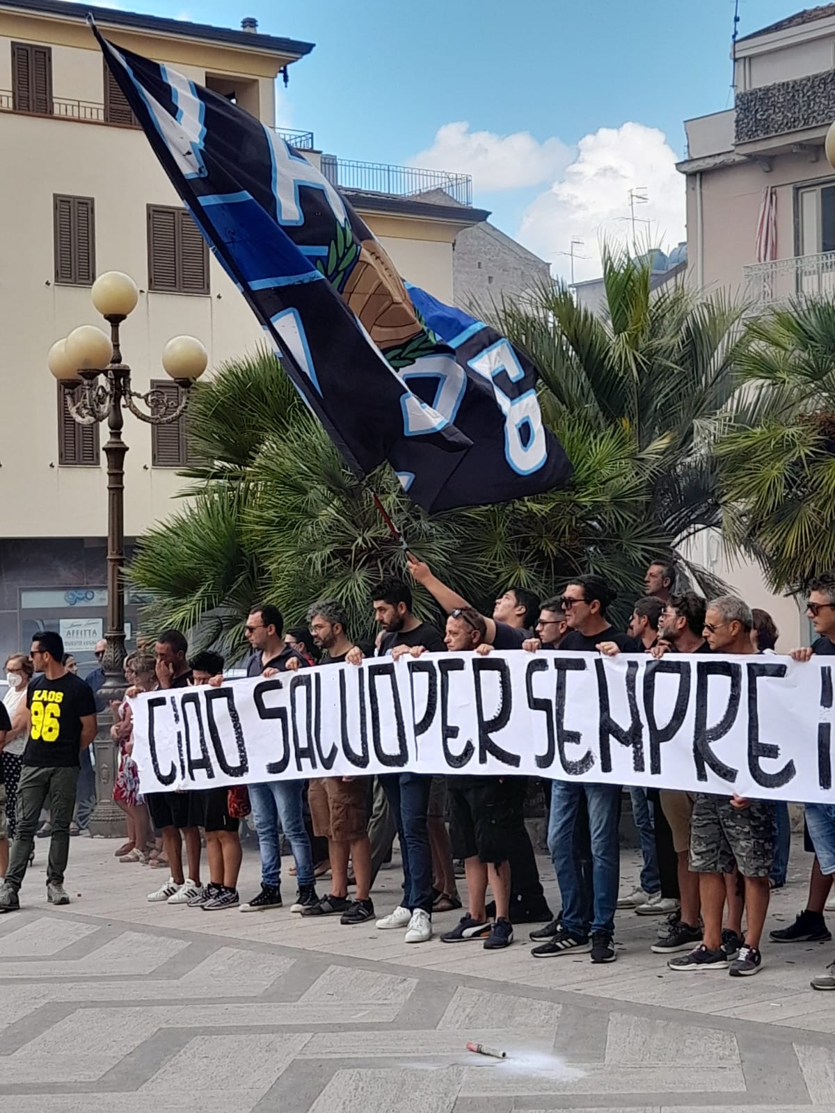 Sul sagrato della Chiesa commovente il saluto tributato dai tifosi del gruppo “Kaos ‘96” che, insieme ai giocatori del Città di Sant’Agata ed alla dirigenza, hanno esposto uno striscione con la scritta “Ciao Salvo, per sempre con noi”.