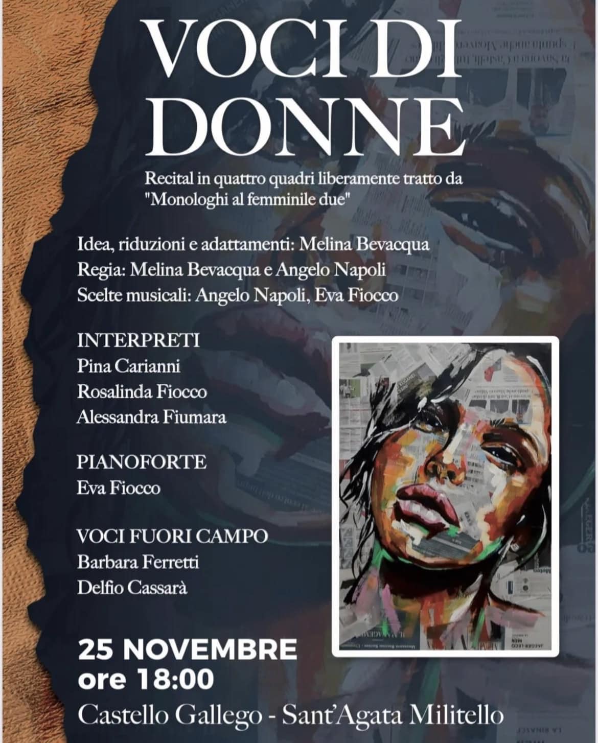Alle 18, quindi, al castello Gallego, ci sarà l’appuntamento con “Voci di donne”, recital a cura di Melina Bevacqua, con la regia della stessa autrice e di Angelo Napoli.