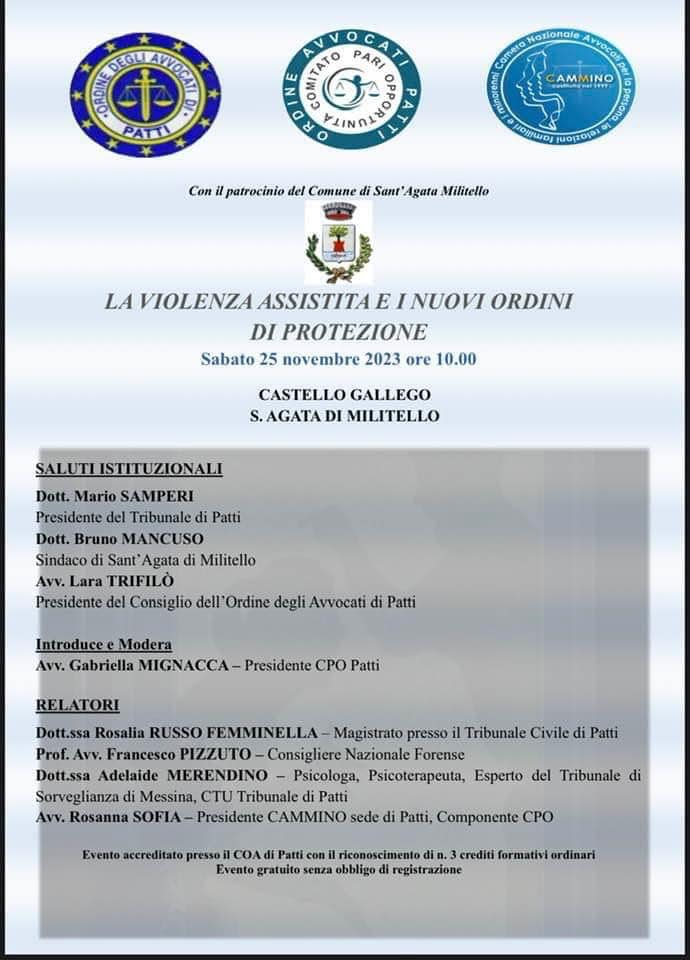 Sempre durante la mattina di sabato, al castello Gallego, evento formativo dal titolo “La violenza assistita e i nuovi ordini di protezione, organizzato dal Comitato Pari Opportunità presso il Consiglio dell’Ordine degli Avvocati di Patti insieme con l’Associazione in Cammino, con il patrocinio del COA di Patti e del Comune di Sant’Agata di Militello.