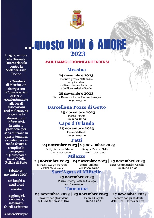 Nel pomeriggio di sabato, dalle 16 alle 20, in piazza Crispi, farà tappa la campagna della Polizia di Stato contro la violenza di genere “Questo non è amore” con attività di prossimità volte ad informare e sensibilizzare organizzate dalla Questura di Messina. Saranno presenti punti informativi presieduti da personale della Polizia di Stato, congiuntamente ad associazioni e centri anti-violenza del territorio.