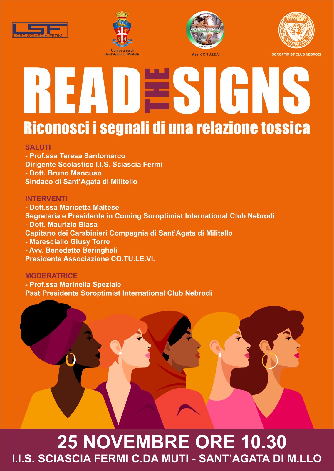 In mattinata presso l’aula magna di contrada muti del Liceo Sciascia-Fermi ci sarà il convegno dal titolo “Read The Signs – Riconosci i segnali di una relazione pericolosa”, organizzato dal Soroptimist Club Nebrodi in collaborazione con l’associazione CO.TU.LE.VI. e la Compagnia dei Carabinieri di Sant’Agata di Militello.