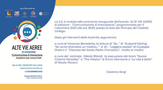 “A distanza di tre anni dalla pandemia, la situazione della sanità in Italia attraversa ancora una grave fase di criticità, ormai diventata strutturale. Le guerre in Ucraina e in Medio Oriente, la crisi climatica, i movimenti migratori e la corruzione rischiano di portare l’intera umanità sull’orlo del baratro. La disinformazione, che rende credibili notizie false, presentandole convincenti e convenienti, costituisce l’ostacolo maggiore per una presa di coscienza, indispensabile per contrastare tali derive”, sottolineano in una nota gli organizzatori. “Dopo queste riflessioni, il Comitato Scientifico ha voluto scegliere il titolo e gli argomenti della XI edizione di Alte Vie Aeree, ritenendo che “Comunicazione & Innovazione” siano elementi indispensabili per contrastare l’attuale crisi culturale e socio-sanitaria”.