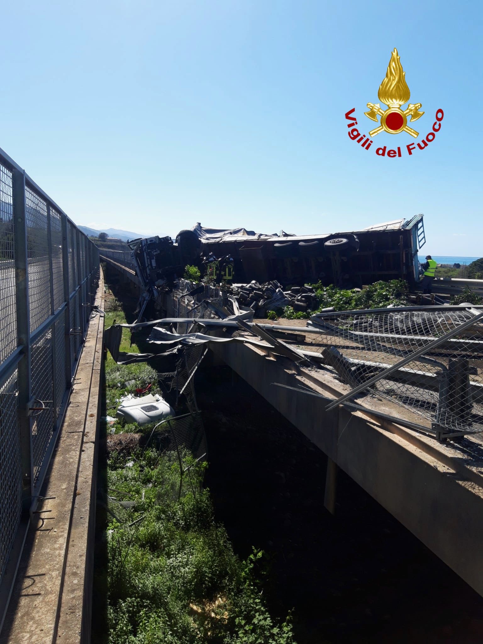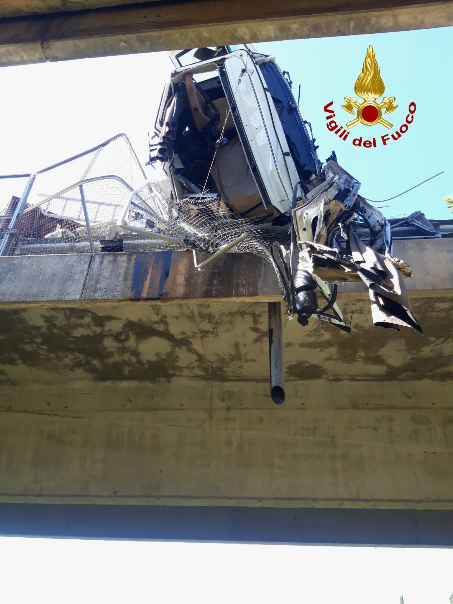 Sul posto il personale dei Vigili del fuoco, prontamente intervenuto , ha constatato il decesso del conducente del TIR precipitato giù dal viadotto.