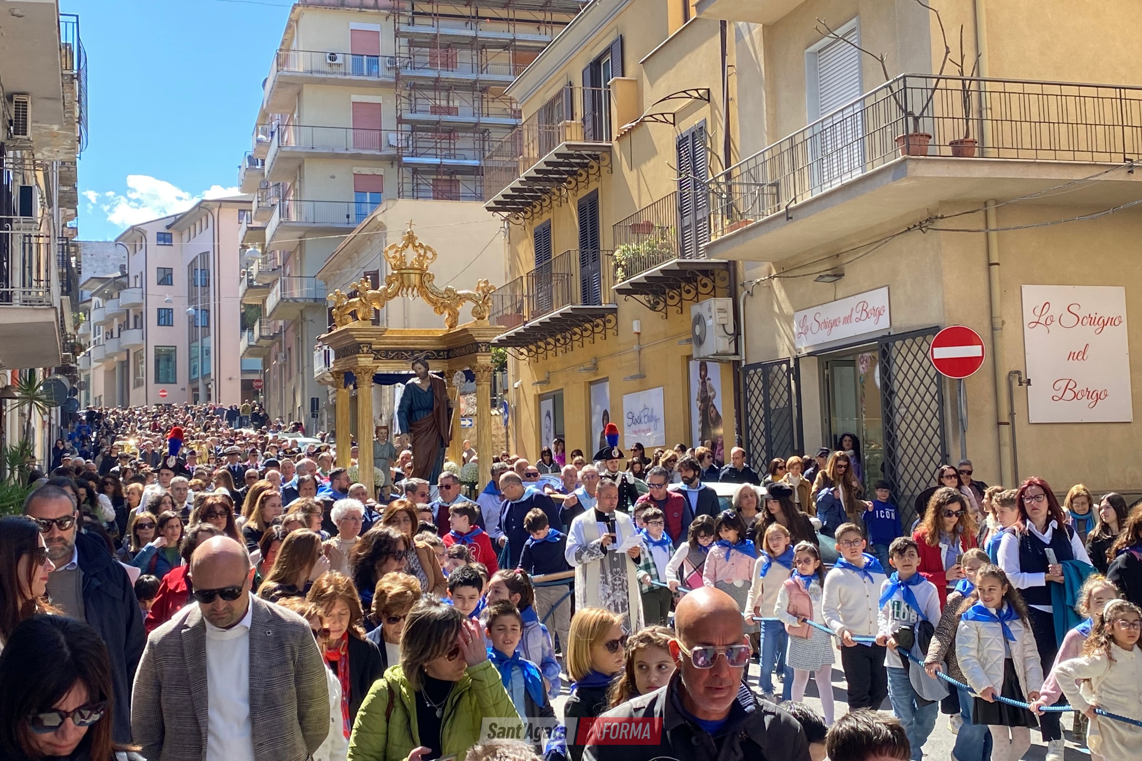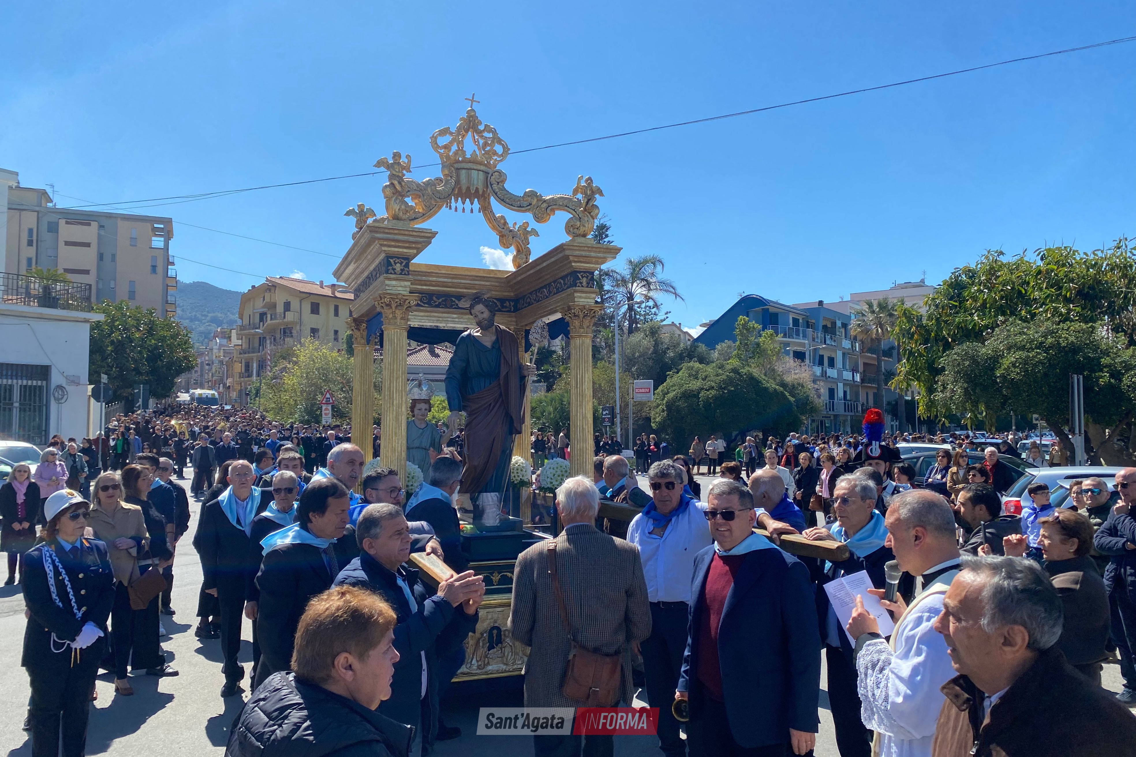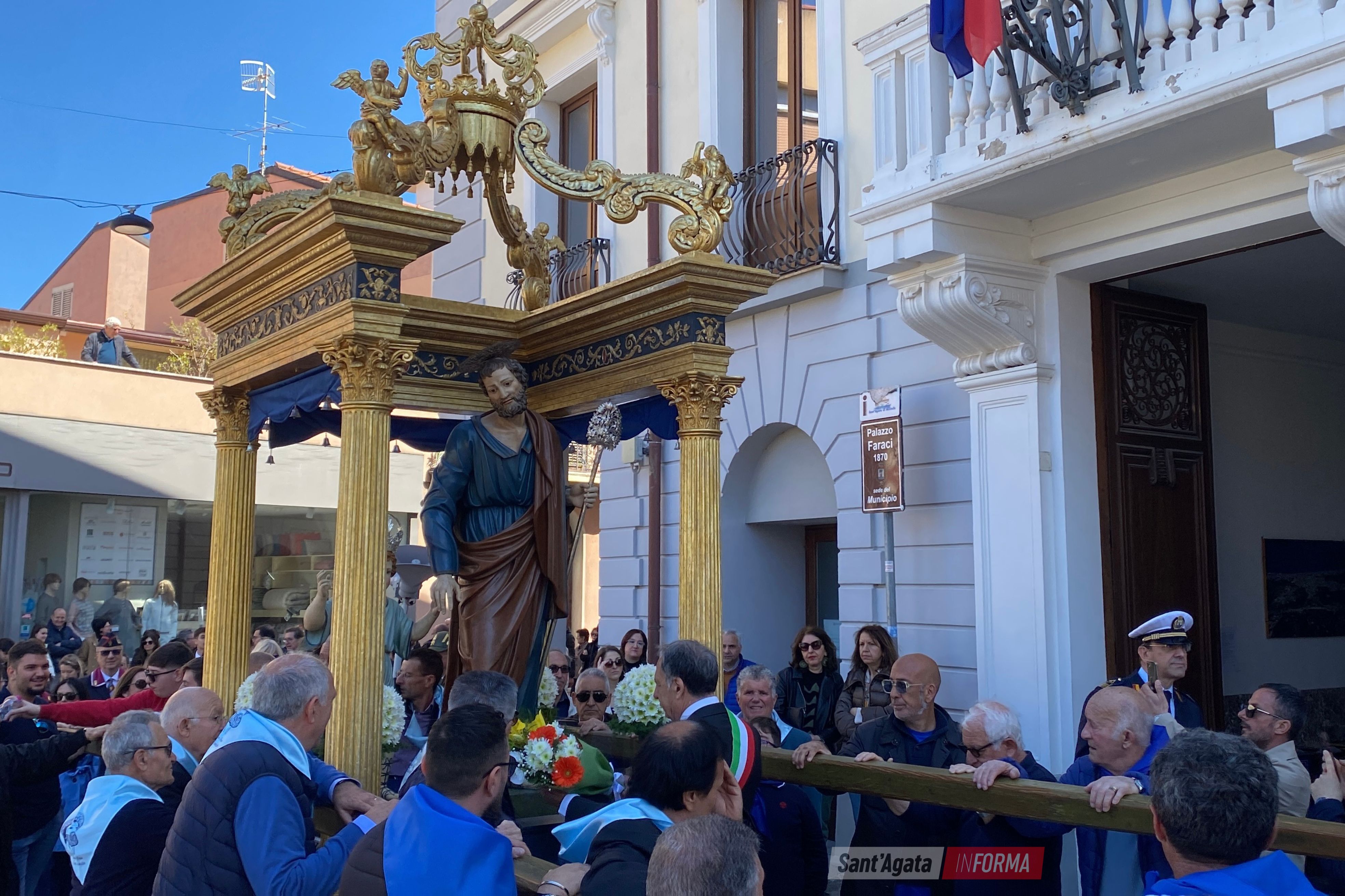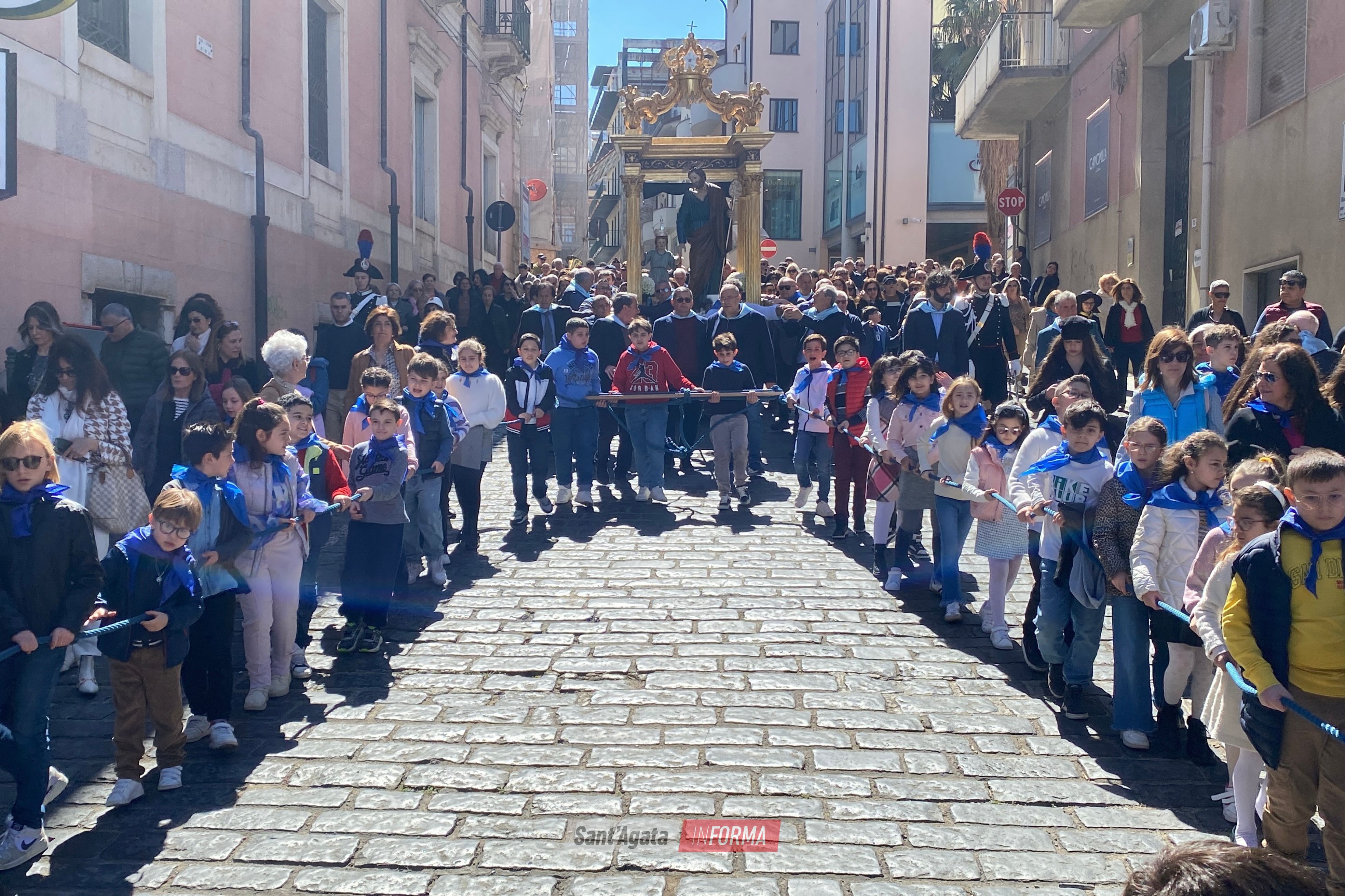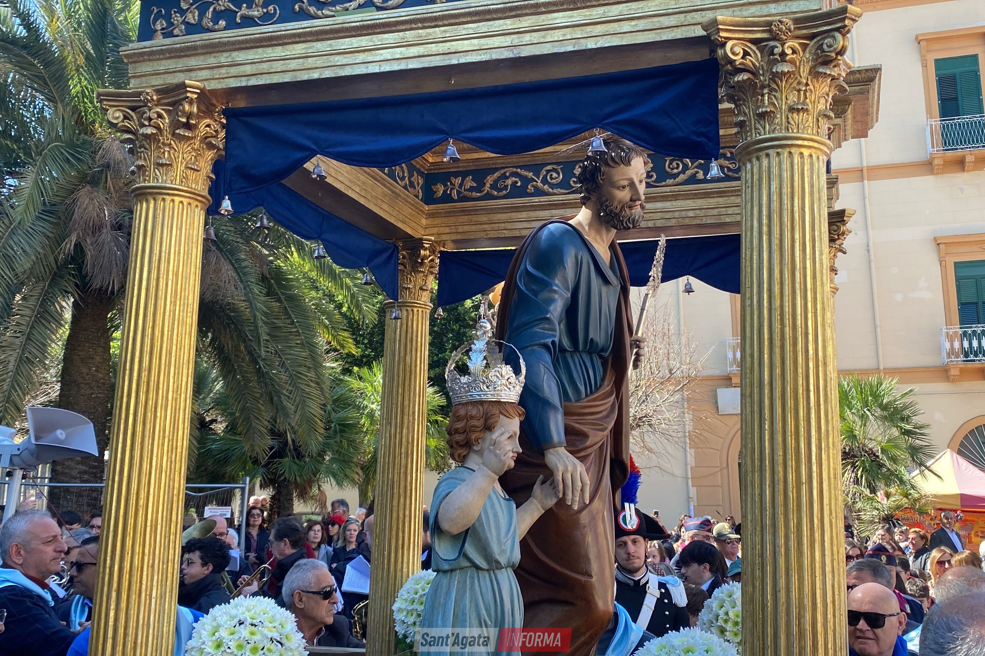 Subito dopo la Processione del simulacro di San Giuseppe col Bambino Gesù, accompagnata da una folla di fedele e preceduta da tanti bambini che hanno sorretto il cordone, è partito da piazza Duomo per attraversare le vie del centro cittadino. Di fronte al palazzo Municipale, quindi, il tradizionale omaggio da parte del sindaco Bruno Mancuso che ha rinnovato l’atto di affidamento della città al Santo Patrono.